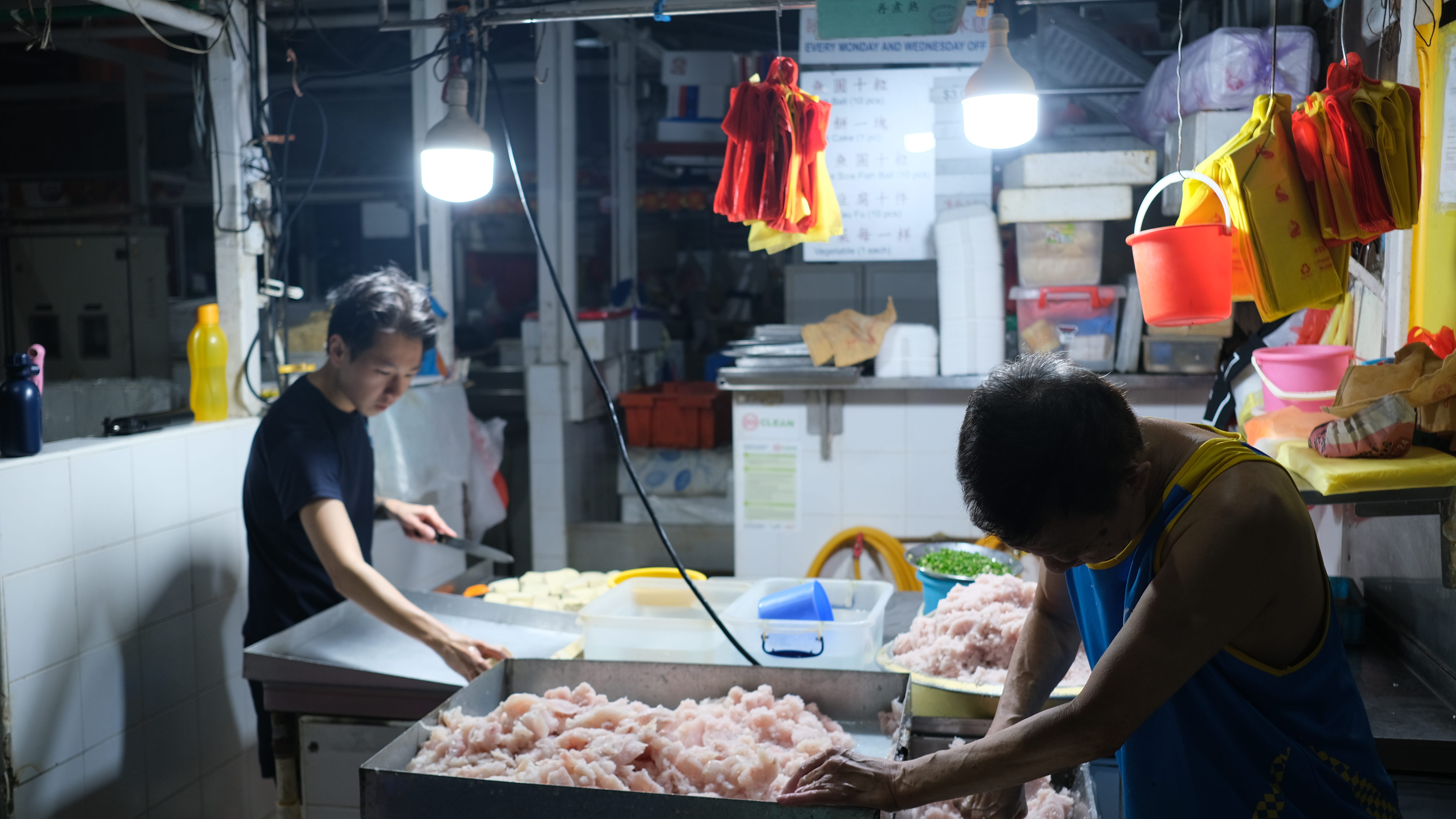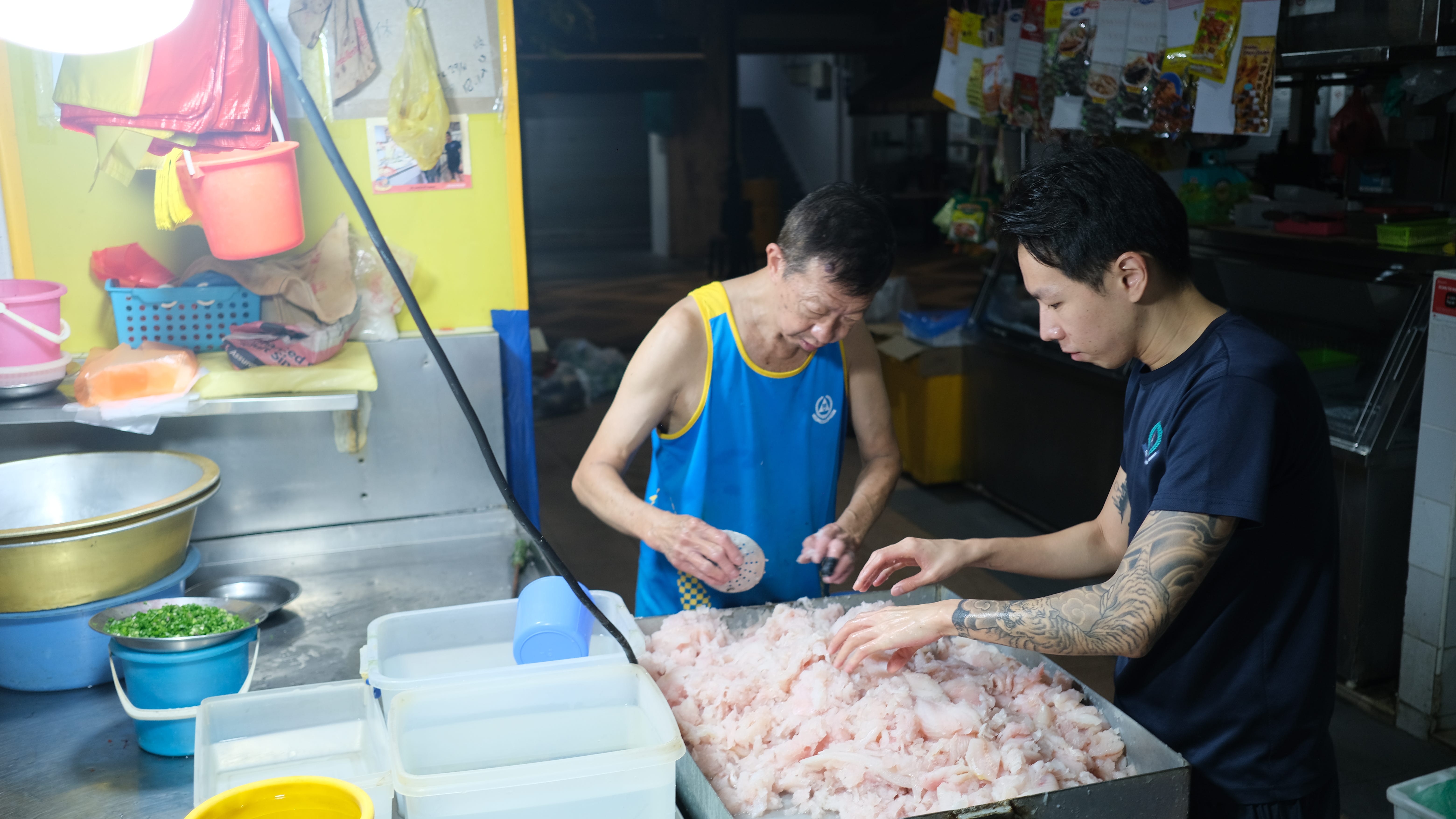 Among them is 26-year-old Delonix Tan, a third-generation fish ball maker at Sandai Fishball, and his father. Like clockwork, the father-son duo carefully grinds fresh yellowtail fish into a fine paste – the key ingredient behind their signature fish balls. Brine is gradually added to the mix, and the duo begin to work their magic.
